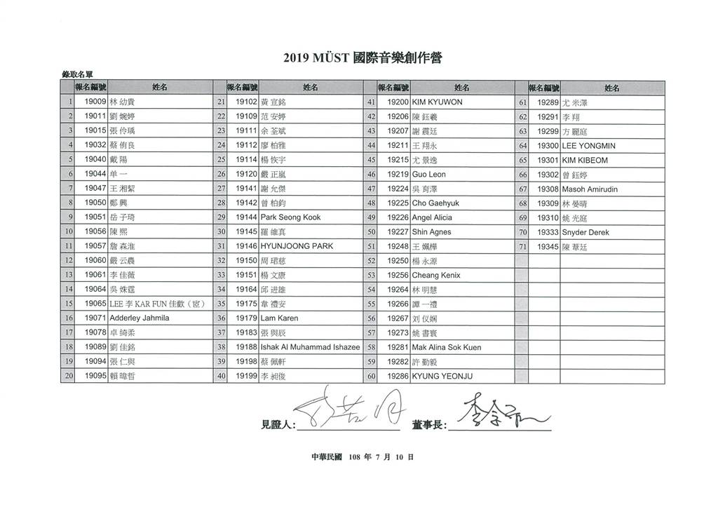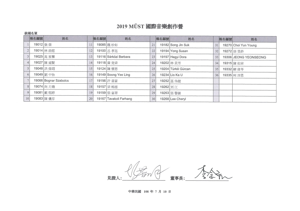2019 MÜST國際音樂創作營 錄取/候補名單